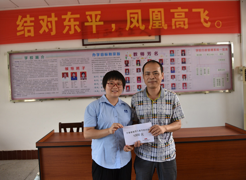 萬事泰集團來到集團外來工子女較多的鳳凰小學慰問,并將慰問金交付到魏校長手中。