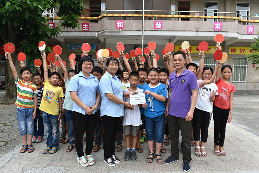 萬事泰集團員工代表將慰問金交付給王香地小學師生手中,并與大家親切的合影留念。