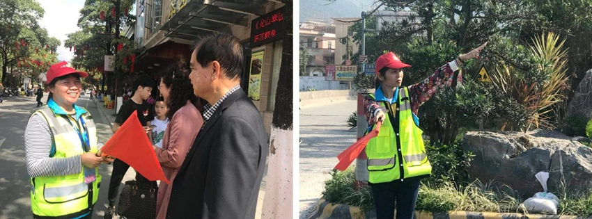 春節期間景區交通流量成倍增加,萬事泰志愿者團隊身穿紅馬甲、手拿小紅旗,在交通崗上引導司機和行人按照路況安排行進,還有志愿者分散在周圍路口,揮動小旗、吹著哨,進行交通引導,協助交警維持交通秩序,全天候地開展景區秩序維護、安全疏導、協調幫助等志愿服務工作。
